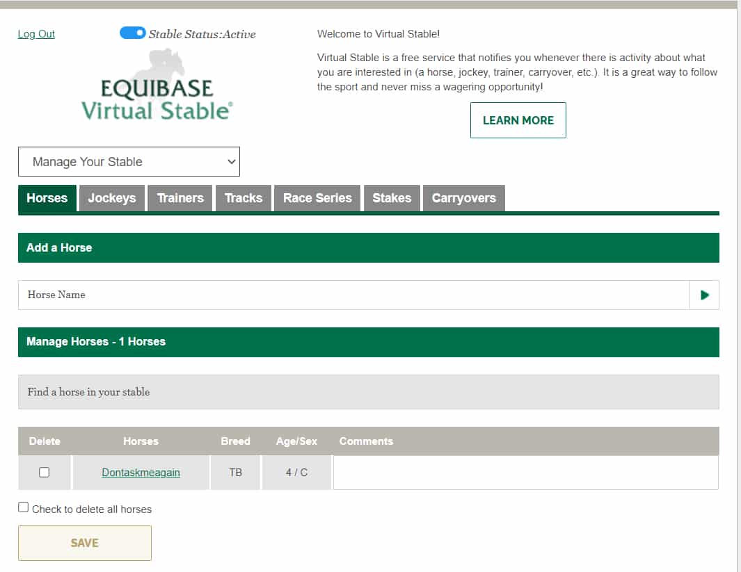 It might be a certain look, a conformational trait or the perfect gait for your discipline of choice. Whatever the reason, you’ve spied a horse in the paddock or on the track you ’d love to make your own. An easy way to follow his career is to add him to a virtual stable on a site such as Equibase, Brisnet or TVG. You must create a free account, but you’ll get notifications every time the horse works or races and alerts with race results. You can also use such sites to learn more about him.