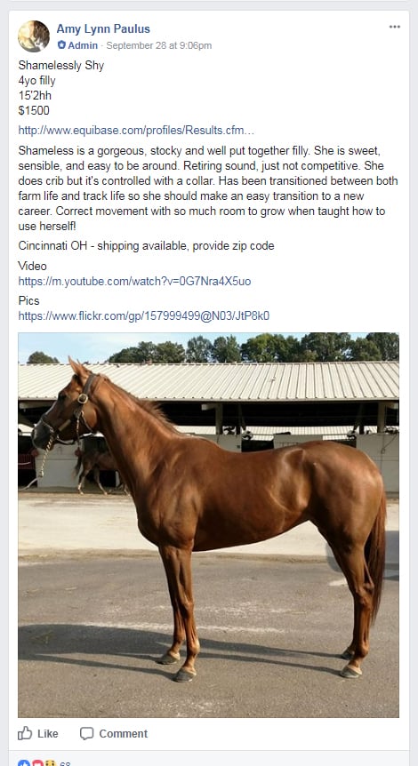 If you follow any of the OTTB groups on Facebook, you know the social network prohibits the sale of animals on its site. So users have gotten creative about promoting horses available for purchase: “Halter for sale! Includes 16.2-hand OTTB, sound, ready to go.”
