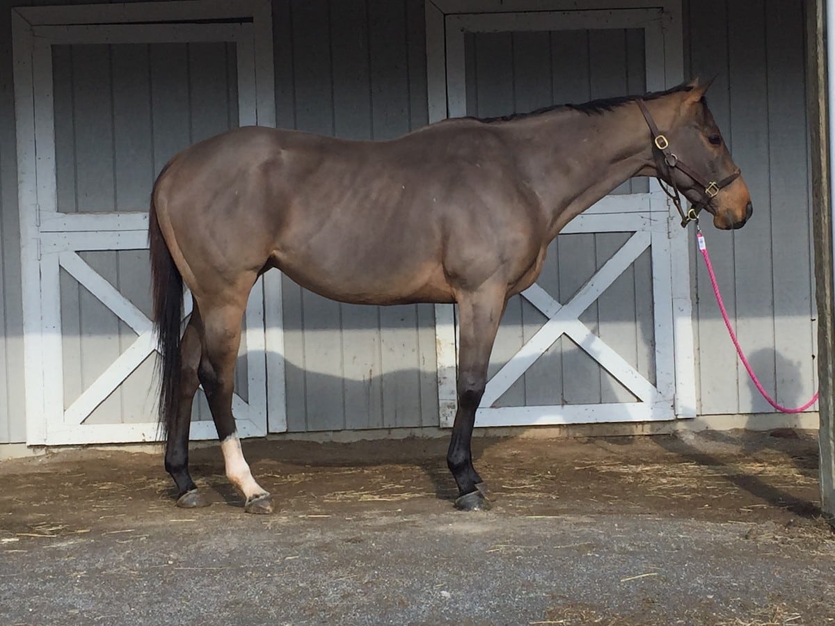 One such photo drew her to Jacapo, her 2019 prospect: “There was a photo where he was ground-tied,” she says. “The rope was just hanging from his halter … and he was still on the track. He had a soft, relaxed eye and an expression that says, ‘Hey, I want to be your new best friend!’