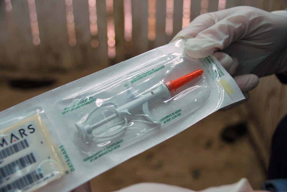Don’t let this harpoonlike microchip applicator fool you: Chips are the size of a grain of rice, and horses tolerate their insertion well. Photo by Alexandra Beckstett