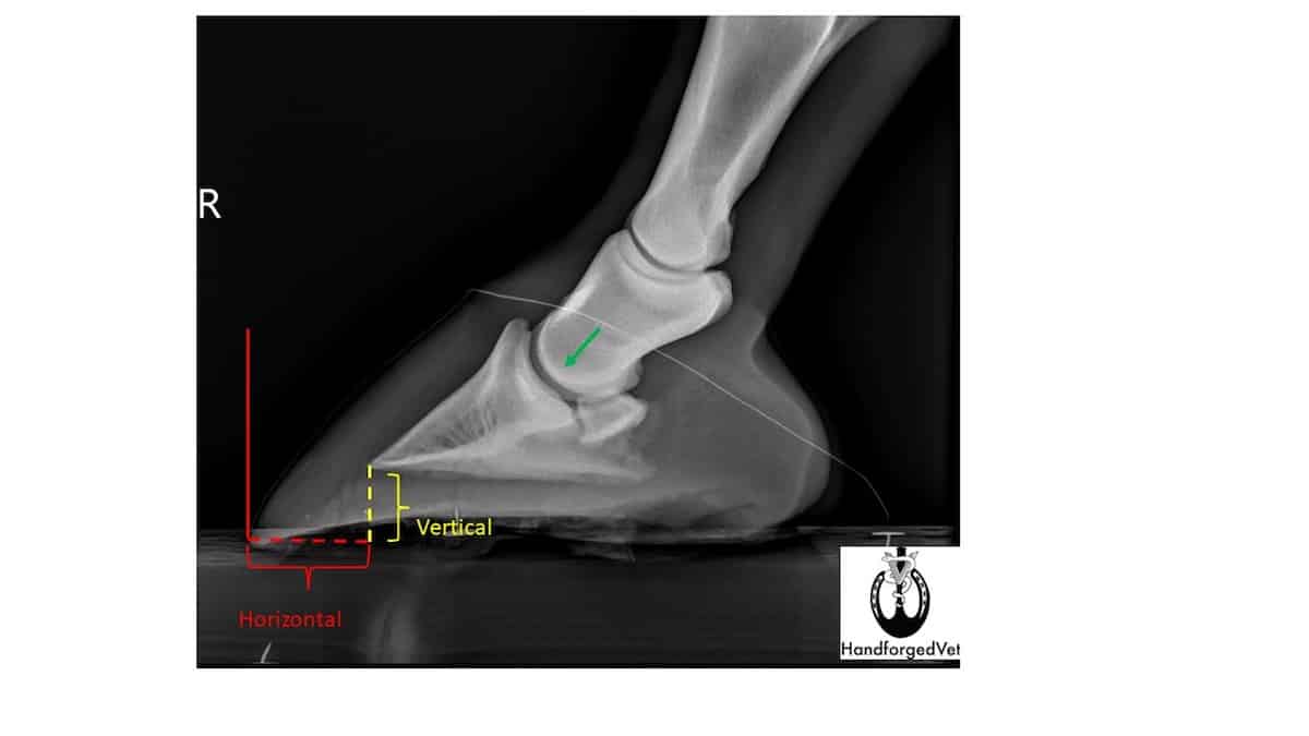 “When I see thin walls and soles in an OTTB, is it usually in an animal which is prone to having a naturally long, horizontal foot,” says Adam Pendleton, DVM, certified journeyman farrier and owner of HandForgedVet, in Marblehead, Ohio, whose practice focuses on sports medicine and podiatry. “A horizontal foot is when there is a long distance from the tip of the coffin bone to the tip of the toe, as opposed to a … foot with vertical depth. Vertical depth is what protects the internal structures of the hoof, and horizontal length is what gives resistance to the ground for propulsion.”