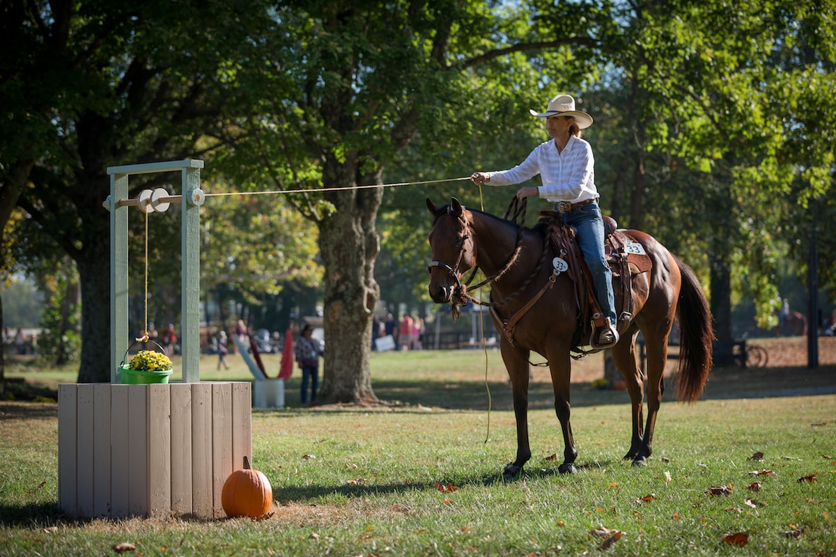 Each station on the trail course is designed to test the horse and rider’s ability to work together as a team, explains Chris Pepplitsch, of Lexington, Kentucky, who grew up in a racing family and worked in the industry for several decades. Today she participates in and helps organize trail challenges and has served as both course designer and steward for Competitive Trail at the Makeover.