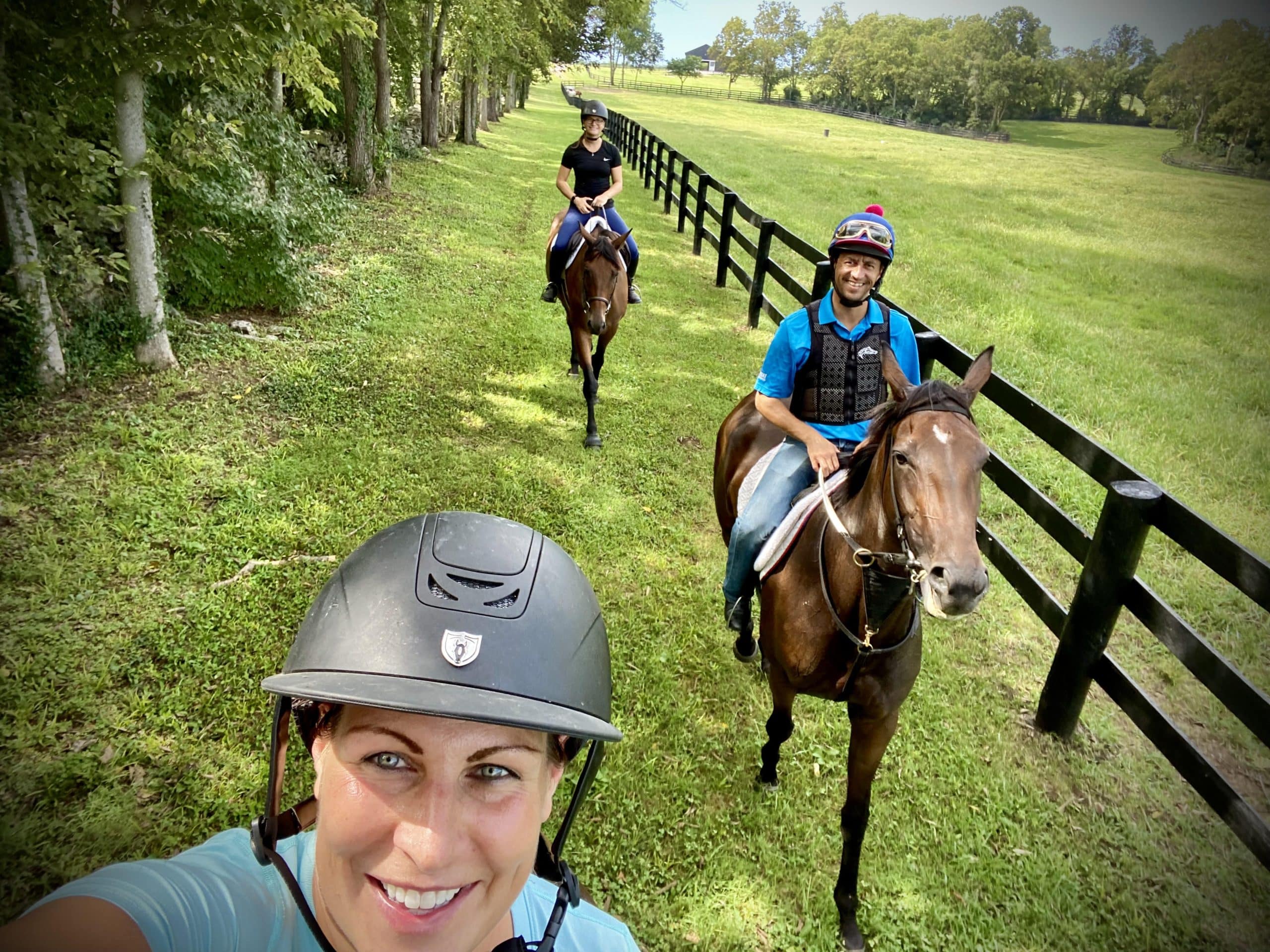 Jen Roytz, former jockey David Meah (on Fiddle) and trainer Anna Meah take a ride around Brownstead Farm. Courtesy Jen Roytz