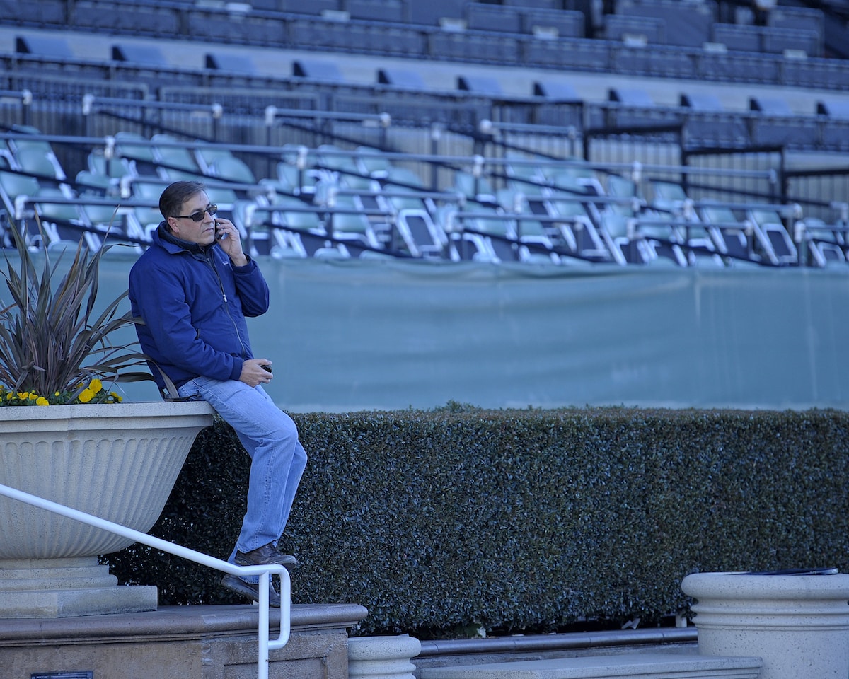 Trainer John Sadler oversees a large racing stable in Southern California. He monitors his horses’ morning workouts and adjusts each horse’s schedule as that individual requires. Courtesy Anne Eberhardt/The Horse Staff