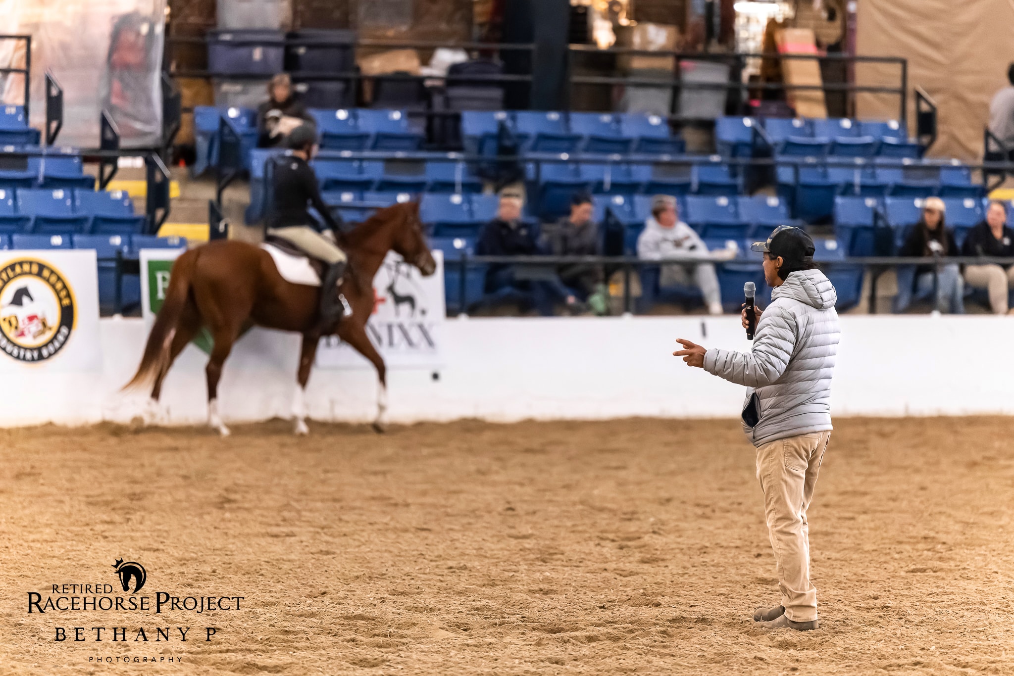 The TCA Covered Arena saw plenty of action on Friday morning as the Makeover Master Class, sponsored by Thoroughbred Education and Research Foundation (TERF), kicked things off at 9 AM with clinician Jorge Vasquez. Vasquez is the USPA Midstates Circuit Governor, co-founder of the Commonwealth Polo Club, and the Gainesway Farm Polo Manager. He guided four participating riders and their mounts through flat work exercises that, while intended to support a transition to a career in polo, had applicable value for riders of all disciplines. Jen Roytz provided additional commentary.