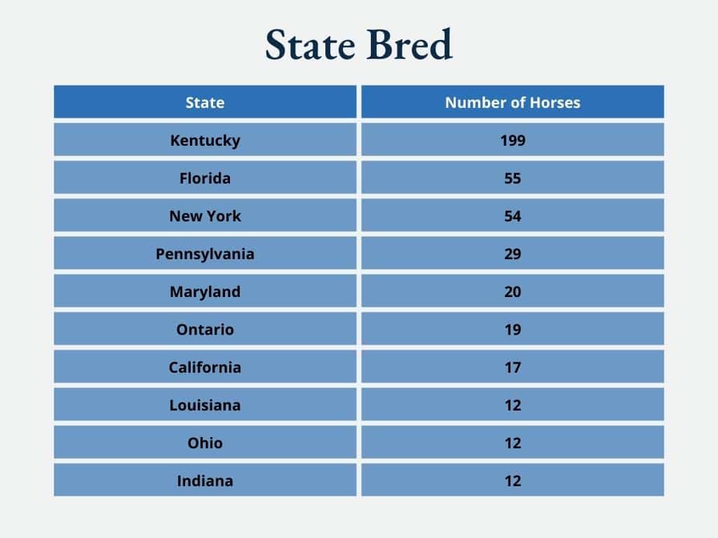 Kentucky traditionally breeds a little over a third of our entries each year, but Florida and New York each bred 10% or more of the class as well. Here are the top ten states represented: