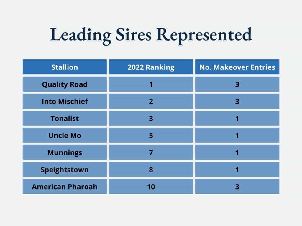 It’s fun to see which of the leading sires of 2022 (as reported by Bloodhorse as of press time) are represented by Makeover entries: