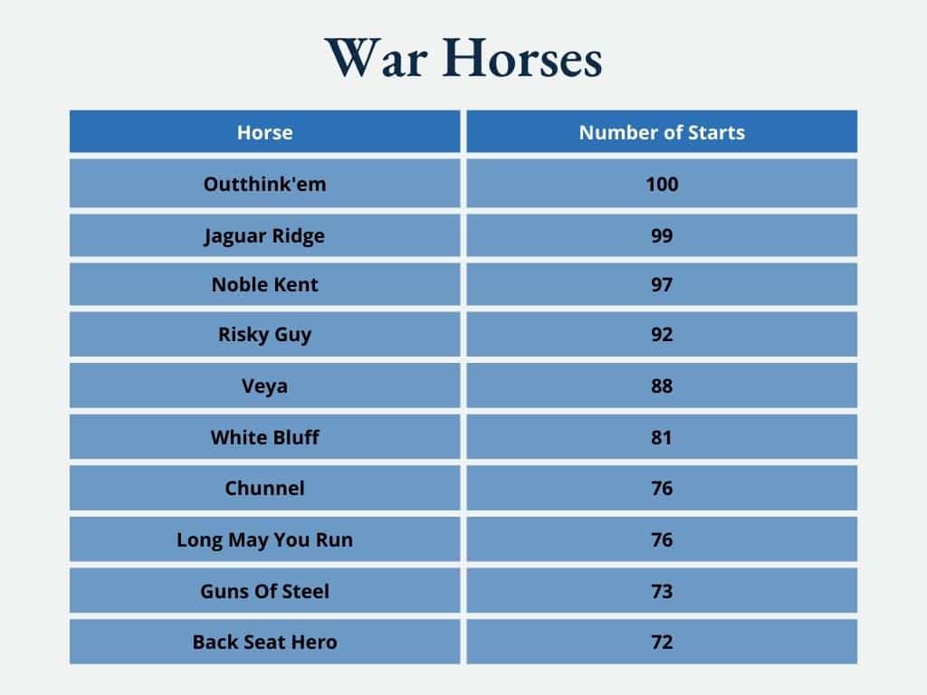 To be eligible for the Thoroughbred Makeover, a horse must have been in training to race and must have at least one published work — and for about 8% of our entries, that’s as far as their race careers ever went. Others, including the top 10 listed below, achieved “war horse” status, making over 50 career starts.