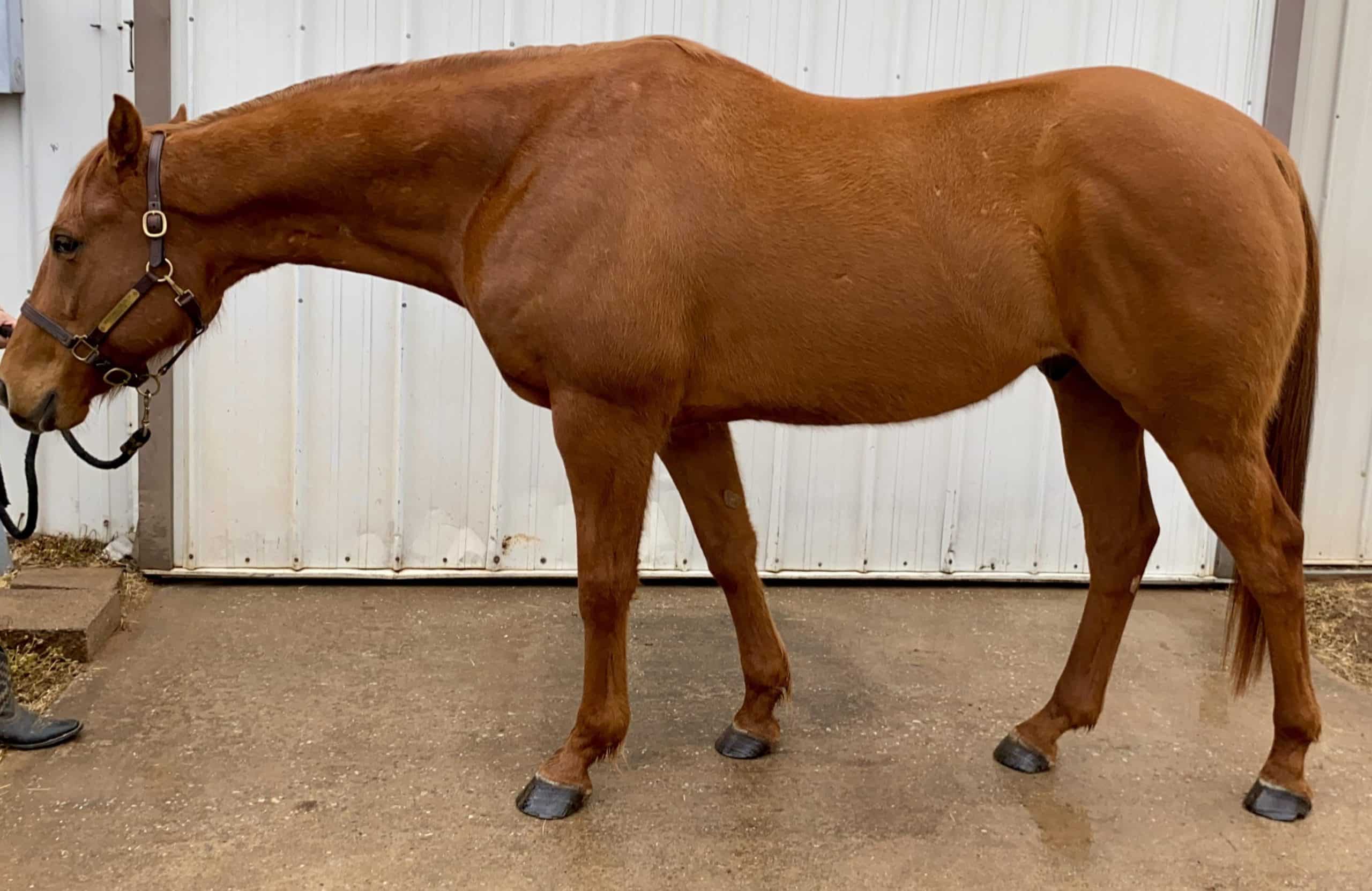 Horse 2: This horse appears to be newer off the track compared to the other two but again has qualities that I really like. He’s a little bit weaker in his top line and flatter in his croup, but I love how he has a shorter pastern and appears balanced in his shoulder and his hip. To me, this gelding is more of an “English” type horse. I think with some let down time and some body work focusing on developing this horse’s top line, he could make someone an excellent prospect.