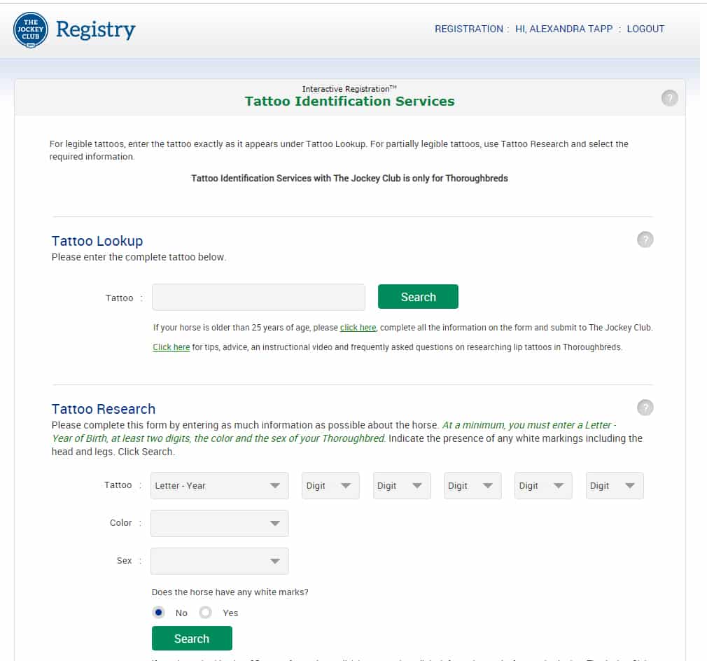 Write down what you believe the tattoo to be, and go to Registry.JockeyClub.com. You’ll be prompted to sign up for Interactive Registration (it’s free) or to log in if you already have an account. Under “Other Forms,” in the brown column on the right, click on “Research a Tattoo.” There you’ll find a Tattoo Lookup blank to use if you’re confident about the letter and digits.