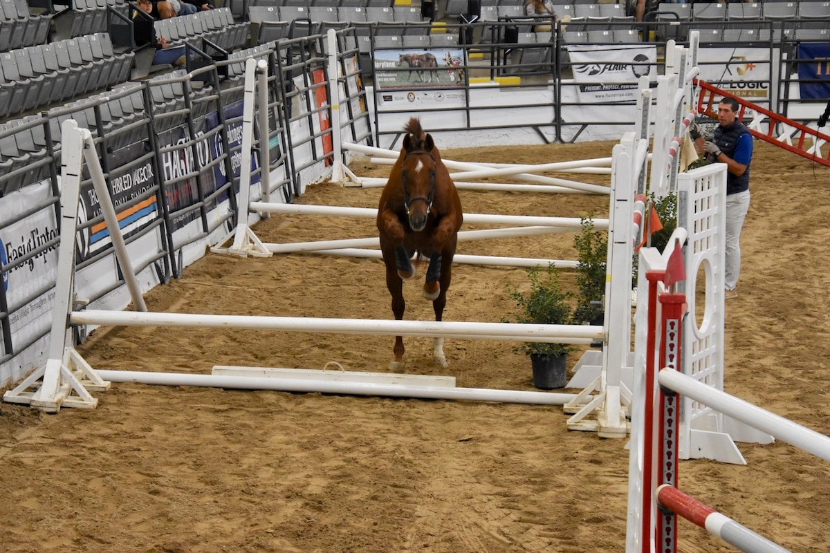 “Most of the time Thoroughbreds get picked (for sport) off of the racetrack,” Douzant says. “They’re trained to race, and usually they are bought for new careers off of a video of a trot back and forth. The main thing (free jumping can help with) at first is to assess a horse’s potential and to see them move. You can also see a little bit of their temperament — whether they are calm, nervous or excited” in the environment.